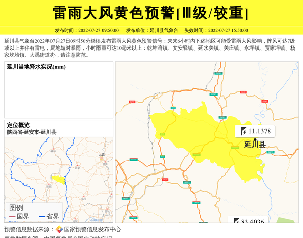 延川县气象台2022年07月27日09时50分继续发布雷雨大风黄色预警信号:未来6小时内下述地区可能受雷雨大风影响,阵风可达7级或以上并伴有雷电,局地短时暴雨,小时雨量可达10毫米以上:乾坤湾镇、文安驿镇、延水关镇、关庄镇、永坪镇、贾家坪镇、杨家圪坮镇、大禹街道办,请注意防范。 信息来源:国家预警信息发布中心; 发布单位:延川县气象台。