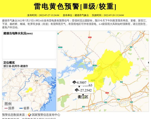 建德市气象台2022年7月27日13时24分发布雷电黄色预警信号:受强对流云团影响,预计今天下午到夜里我市寿昌、更楼、新安江、下涯、杨村桥、梅城、乾潭等乡镇(街道)有雷阵雨天气,有雷雨地区可伴有强雷电、6-8级雷雨大风和短时强降雨,请注意防范,避免户外活动。 信息来源:国家预警信息发布中心; 发布单位:建德市气象台。