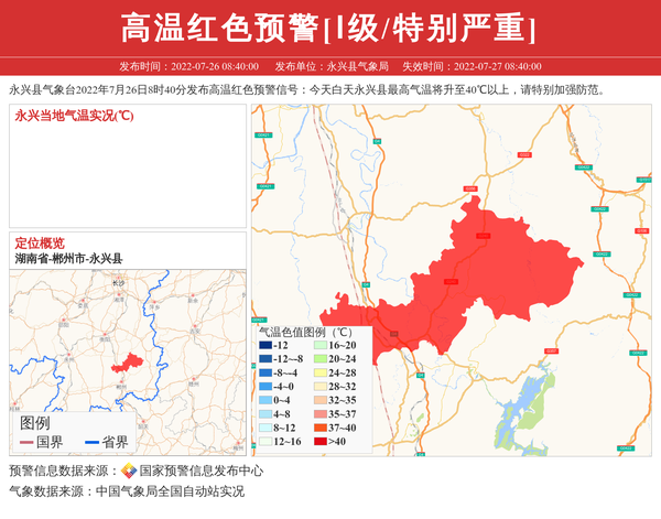 永兴县气象台2022年7月26日8时40分发布高温红色预警信号:今天白天永兴县最高气温将升至40℃以上,请特别加强防范。 信息来源:国家预警信息发布中心; 发布单位:永兴县气象局。