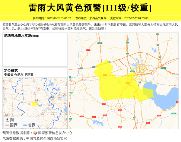 肥西县气象台2022年07月26日04时59分发布雷雨大风黄色预警信号。未来6小时内我县官亭镇、三河镇等大部分乡镇将出现雷雨大风天气,风力达7-8级并可能伴有雷电、短时强降水等对流性天气。请注意防范! 信息来源:国家预警信息发布中心; 发布单位:肥西县气象局。