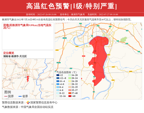 株洲市气象台2022年7月26日9时18分发布高温红色预警信号:今天白天天元区最高气温将升至40℃以上,请特别加强防范。 信息来源:国家预警信息发布中心; 发布单位:株洲市气象局。