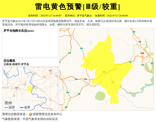 罗平县气象台2022年7月27日14时40分发布雷电黄色预警信号:我县长底、九龙、板桥已出现强对流云团,预计未来6小时内将出现雷电活动,并可能伴有局地短时强降水、冰雹、瞬时大风等强对流天气,请注意防范。 信息来源:国家预警信息发布中心; 发布单位:罗平县气象台。