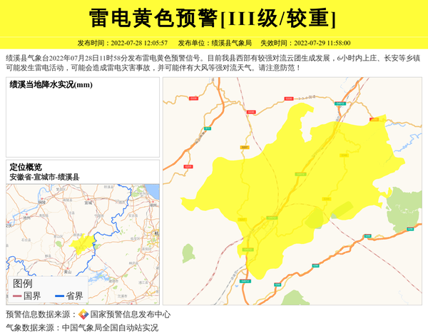 绩溪县气象台2022年07月28日11时58分发布雷电黄色预警信号。目前我县西部有较强对流云团生成发展,6小时内上庄、长安等乡镇可能发生雷电活动,可能会造成雷电灾害事故,并可能伴有大风等强对流天气。请注意防范! 信息来源:国家预警信息发布中心; 发布单位:绩溪县气象局。