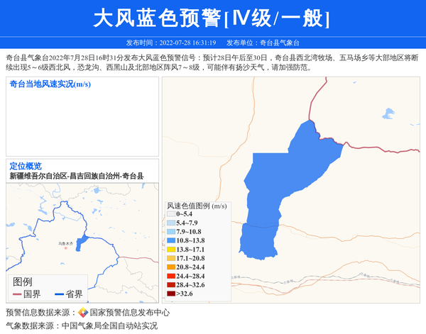 奇台县气象台2022年7月28日16时31分发布大风蓝色预警信号:预计28日午后至30日,奇台县西北湾牧场、五马场乡等大部地区将断续出现5~6级西北风,恐龙沟、西黑山及北部地区阵风7~8级,可能伴有扬沙天气,请加强防范。 信息来源:国家预警信息发布中心; 发布单位:奇台县气象台。