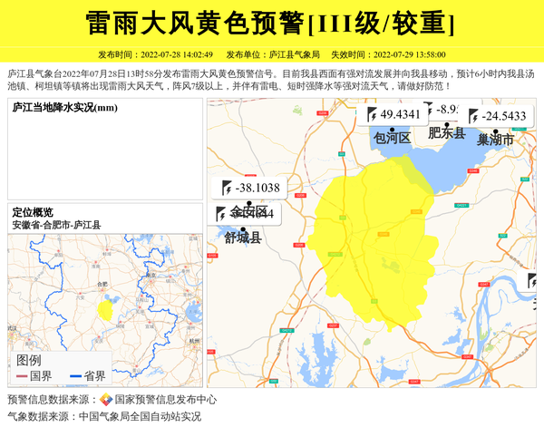 庐江县气象台2022年07月28日13时58分发布雷雨大风黄色预警信号。目前我县西面有强对流发展并向我县移动,预计6小时内我县汤池镇、柯坦镇等镇将出现雷雨大风天气,阵风7级以上,并伴有雷电、短时强降水等强对流天气,请做好防范! 信息来源:国家预警信息发布中心; 发布单位:庐江县气象局。