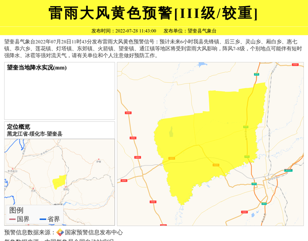 望奎县气象台2022年07月28日11时43分发布雷雨大风黄色预警信号:预计未来6小时我县先锋镇、后三乡、灵山乡、厢白乡、惠七镇、恭六乡、莲花镇、灯塔镇、东郊镇、火箭镇、望奎镇、通江镇等地区将受到雷雨大风影响,阵风7-8级,个别地点可能伴有短时强降水、冰雹等强对流天气,请有关单位和个人注意做好预防工作。 信息来源:国家预警信息发布中心; 发布单位:望奎县气象台。