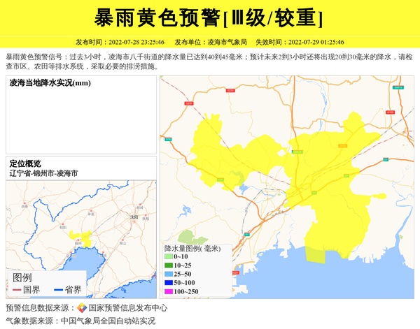 暴雨黄色预警信号:过去3小时,凌海市八千街道的降水量已达到40到45毫米;预计未来2到3小时还将出现20到30毫米的降水,请检查市区、农田等排水系统,采取必要的排涝措施。 信息来源:国家预警信息发布中心; 发布单位:凌海市气象局。