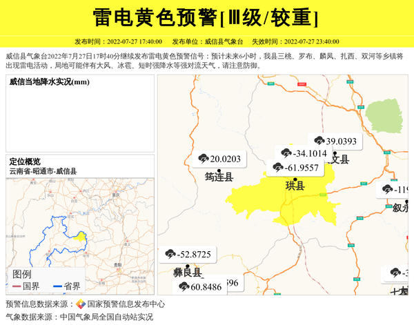 威信县气象台2022年7月27日17时40分继续发布雷电黄色预警信号:预计未来6小时,我县三桃、罗布、麟凤、扎西、双河等乡镇将出现雷电活动,局地可能伴有大风、冰雹、短时强降水等强对流天气,请注意防御。 信息来源:国家预警信息发布中心; 发布单位:威信县气象台。