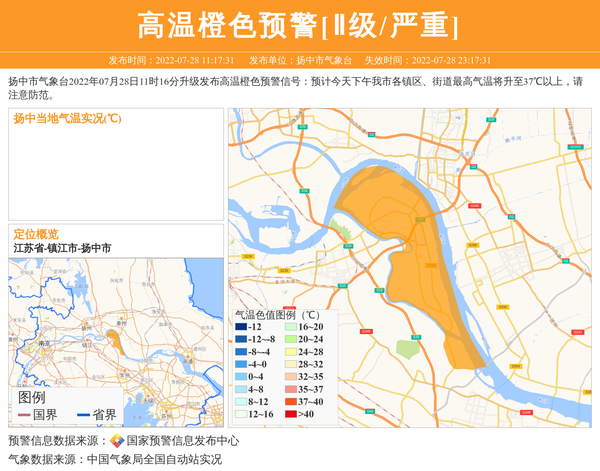 扬中市气象台2022年07月28日11时16分升级发布高温橙色预警信号:预计今天下午我市各镇区、街道最高气温将升至37℃以上,请注意防范。 信息来源:国家预警信息发布中心; 发布单位:扬中市气象台。