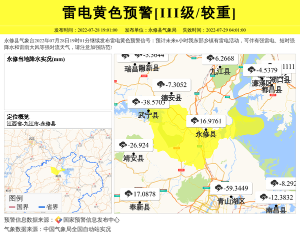 永修县气象台2022年07月28日19时01分继续发布雷电黄色预警信号:预计未来6小时我东部乡镇有雷电活动,可伴有强雷电、短时强降水和雷雨大风等强对流天气,请注意加强防范! 信息来源:国家预警信息发布中心; 发布单位:永修县气象局。
