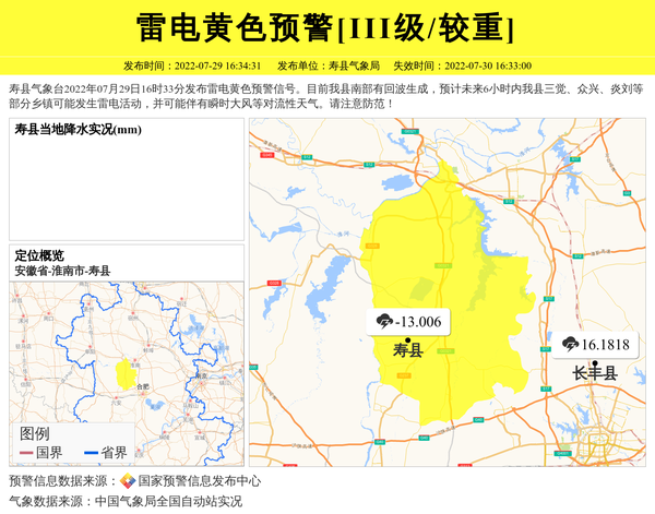 寿县气象台2022年07月29日16时33分发布雷电黄色预警信号。目前我县南部有回波生成,预计未来6小时内我县三觉、众兴、炎刘等部分乡镇可能发生雷电活动,并可能伴有瞬时大风等对流性天气。请注意防范! 信息来源:国家预警信息发布中心; 发布单位:寿县气象局。