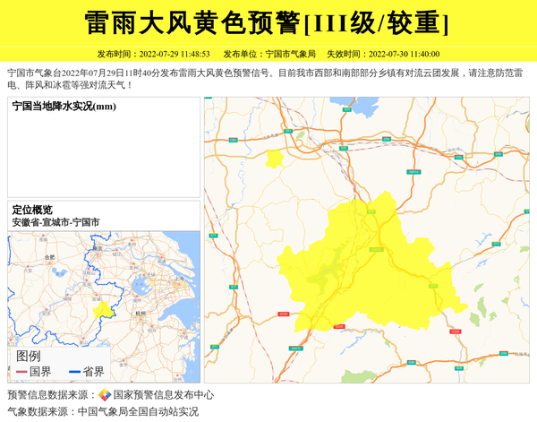 宁国市气象台2022年07月29日11时40分发布雷雨大风黄色预警信号。目前我市西部和南部部分乡镇有对流云团发展,请注意防范雷电、阵风和冰雹等强对流天气! 信息来源:国家预警信息发布中心; 发布单位:宁国市气象局。