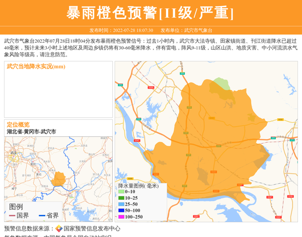 武穴市气象台2022年07月28日18时04分发布暴雨橙色预警信号:过去1小时内,武穴市大法寺镇、田家镇街道、刊江街道降水已超过40毫米,预计未来3小时上述地区及周边乡镇仍将有30-60毫米降水,伴有雷电,阵风9-11级,山区山洪、地质灾害、中小河流洪水气象风险等级高,请注意防范。 信息来源:国家预警信息发布中心; 发布单位:武穴市气象台。