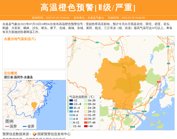 永嘉县气象台2022年07月28日10时06分发布高温橙色预警信号:受副热带高压影响,预计今天白天我县岩坦、巽宅、碧莲、岩头、鹤盛、大若岩、枫林、沙头、桥头、桥下、北城、南城、东城、黄田、瓯北、三江等乡(镇、街道)最高气温可达38℃以上。希各有关方面做好防暑降温工作。 信息来源:国家预警信息发布中心; 发布单位:永嘉县气象台。