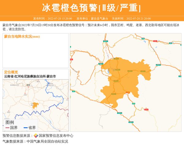 蒙自市气象台2022年7月28日15时20分发布冰雹橙色预警信号:预计未来6小时,我市芷村、鸣鹫、老寨、西北勒等地区可能出现冰雹,请注意防范。 信息来源:国家预警信息发布中心; 发布单位:蒙自县气象台。
