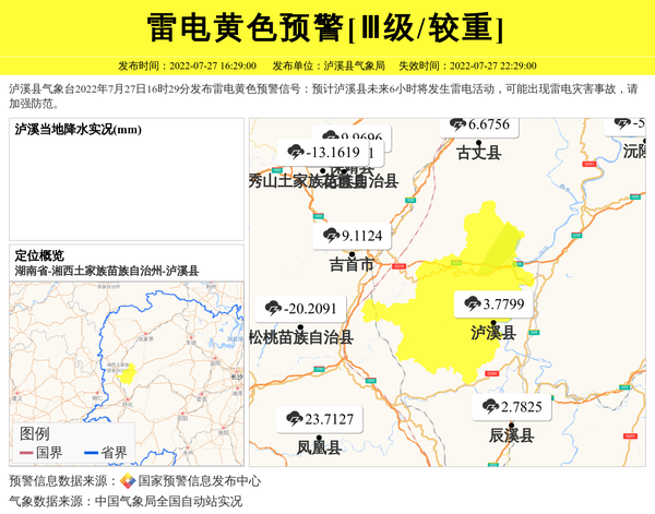 泸溪县气象台2022年7月27日16时29分发布雷电黄色预警信号:预计泸溪县未来6小时将发生雷电活动,可能出现雷电灾害事故,请加强防范。 信息来源:国家预警信息发布中心; 发布单位:泸溪县气象局。
