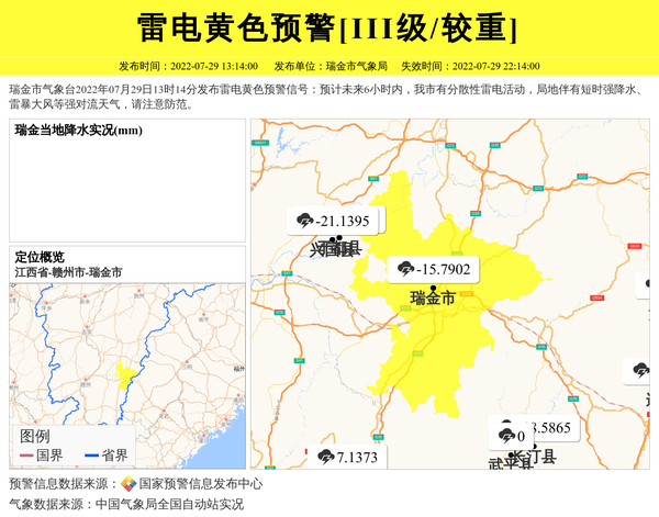 瑞金市气象台2022年07月29日13时14分发布雷电黄色预警信号:预计未来6小时内,我市有分散性雷电活动,局地伴有短时强降水、雷暴大风等强对流天气,请注意防范。 信息来源:国家预警信息发布中心; 发布单位:瑞金市气象局。