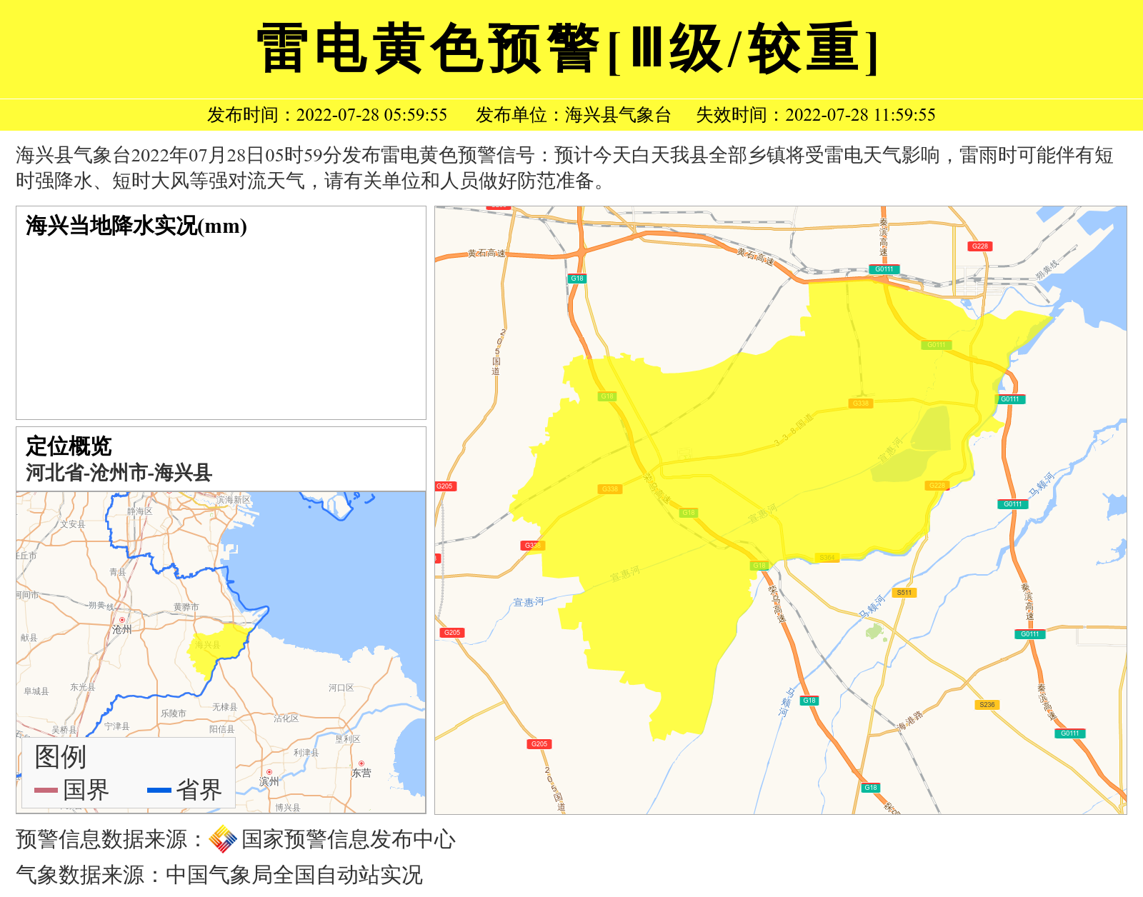 海兴县气象台2022年07月28日05时59分发布雷电黄色预警信号:预计今天白天我县全部乡镇将受雷电天气影响,雷雨时可能伴有短时强降水、短时大风等强对流天气,请有关单位和人员做好防范准备。 信息来源:国家预警信息发布中心; 发布单位:海兴县气象台。