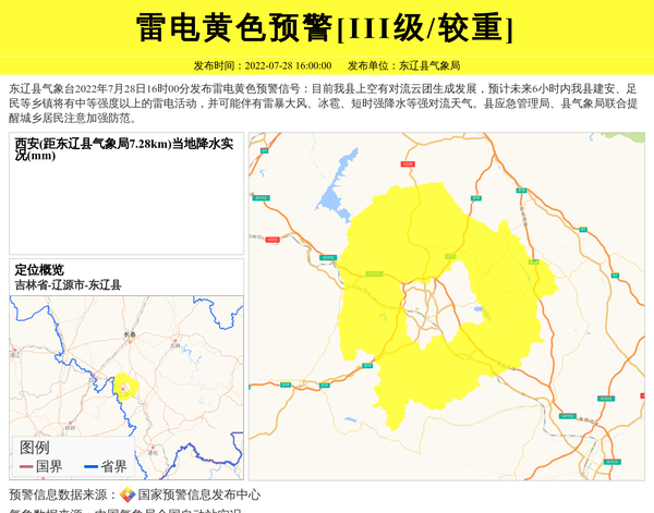 东辽县气象台2022年7月28日16时00分发布雷电黄色预警信号:目前我县上空有对流云团生成发展,预计未来6小时内我县建安、足民等乡镇将有中等强度以上的雷电活动,并可能伴有雷暴大风、冰雹、短时强降水等强对流天气。县应急管理局、县气象局联合提醒城乡居民注意加强防范。 信息来源:国家预警信息发布中心; 发布单位:东辽县气象局。
