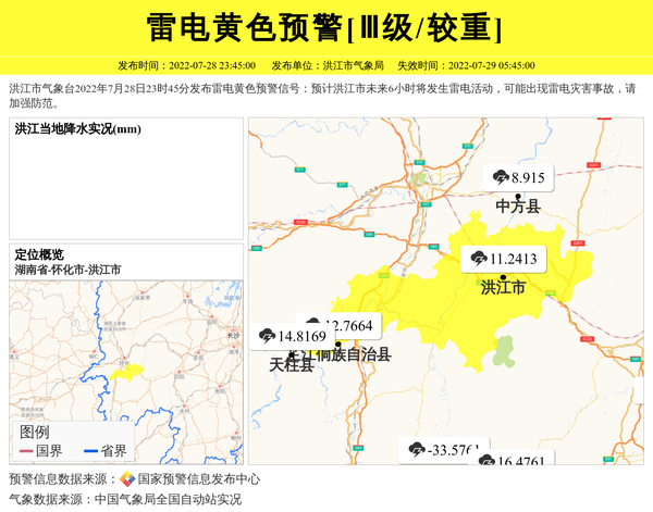 洪江市气象台2022年7月28日23时45分发布雷电黄色预警信号:预计洪江市未来6小时将发生雷电活动,可能出现雷电灾害事故,请加强防范。 信息来源:国家预警信息发布中心; 发布单位:洪江市气象局。