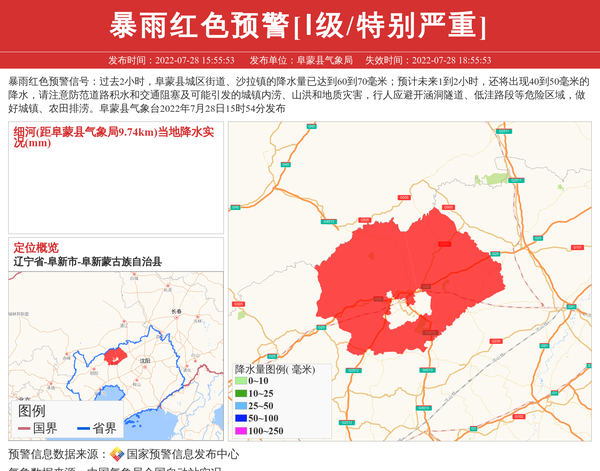 暴雨红色预警信号:过去2小时,阜蒙县城区街道、沙拉镇的降水量已达到60到70毫米;预计未来1到2小时,还将出现40到50毫米的降水,请注意防范道路积水和交通阻塞及可能引发的城镇内涝、山洪和地质灾害,行人应避开涵洞隧道、低洼路段等危险区域,做好城镇、农田排涝。阜蒙县气象台2022年7月28日15时54分发布 信息来源:国家预警信息发布中心; 发布单位:阜蒙县气象局。