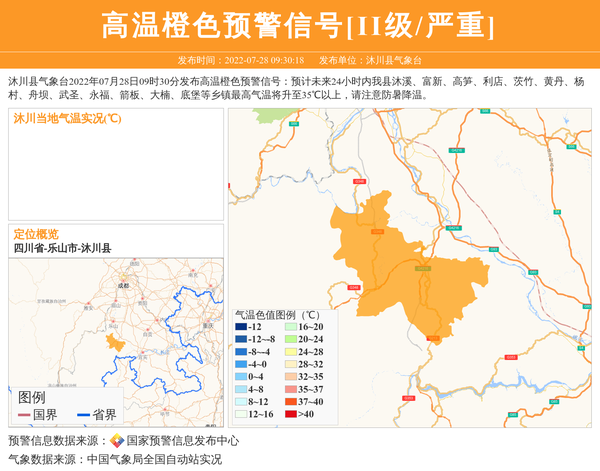 沐川县气象台2022年07月28日09时30分发布高温橙色预警信号:预计未来24小时内我县沐溪、富新、高笋、利店、茨竹、黄丹、杨村、舟坝、武圣、永福、箭板、大楠、底堡等乡镇最高气温将升至35℃以上,请注意防暑降温。 信息来源:国家预警信息发布中心; 发布单位:沐川县气象台。