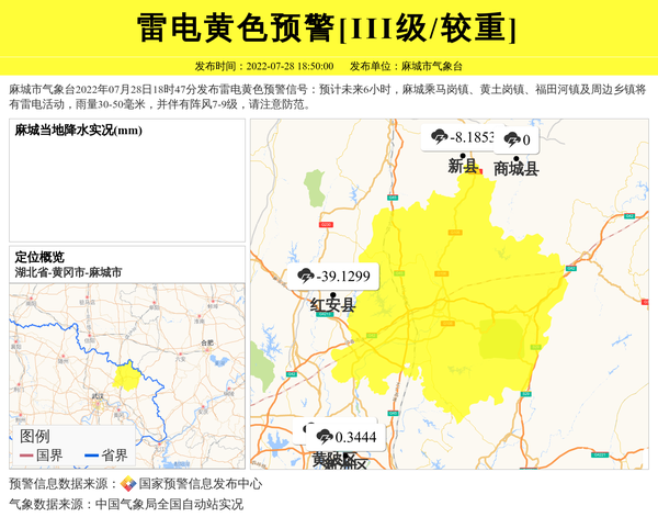 麻城市气象台2022年07月28日18时47分发布雷电黄色预警信号:预计未来6小时,麻城乘马岗镇、黄土岗镇、福田河镇及周边乡镇将有雷电活动,雨量30-50毫米,并伴有阵风7-9级,请注意防范。 信息来源:国家预警信息发布中心; 发布单位:麻城市气象台。