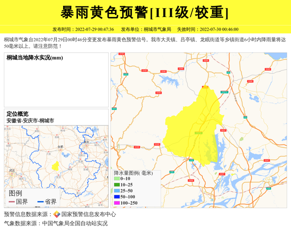 桐城市气象台2022年07月29日00时46分变更发布暴雨黄色预警信号。我市大关镇、吕亭镇、龙眠街道等乡镇街道6小时内降雨量将达50毫米以上。请注意防范! 信息来源:国家预警信息发布中心; 发布单位:桐城市气象局。