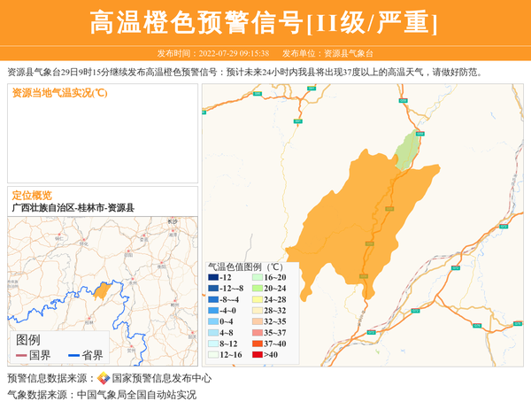 资源县气象台29日9时15分继续发布高温橙色预警信号:预计未来24小时内我县将出现37度以上的高温天气,请做好防范。 信息来源:国家预警信息发布中心; 发布单位:资源县气象台。
