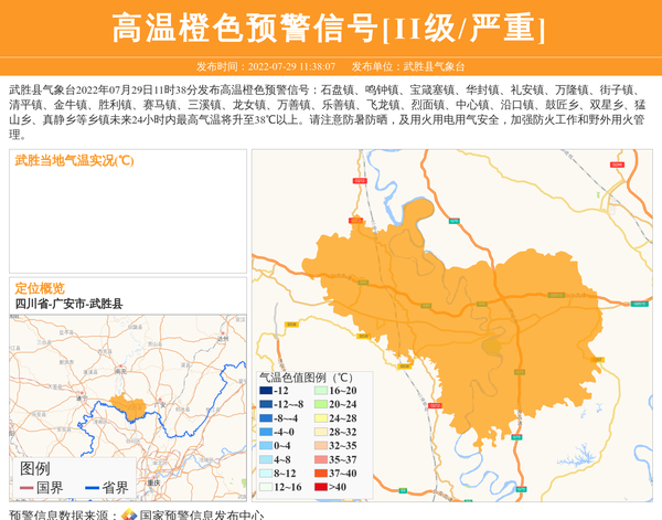 武胜县气象台2022年07月29日11时38分发布高温橙色预警信号:石盘镇、鸣钟镇、宝箴塞镇、华封镇、礼安镇、万隆镇、街子镇、清平镇、金牛镇、胜利镇、赛马镇、三溪镇、龙女镇、万善镇、乐善镇、飞龙镇、烈面镇、中心镇、沿口镇、鼓匠乡、双星乡、猛山乡、真静乡等乡镇未来24小时内最高气温将升至38℃以上。请注意防暑防晒,及用火用电用气安全,加强防火工作和野外用火管理。 信息来源:国家预警信息发布中心; 发布单位:武胜县气象台。