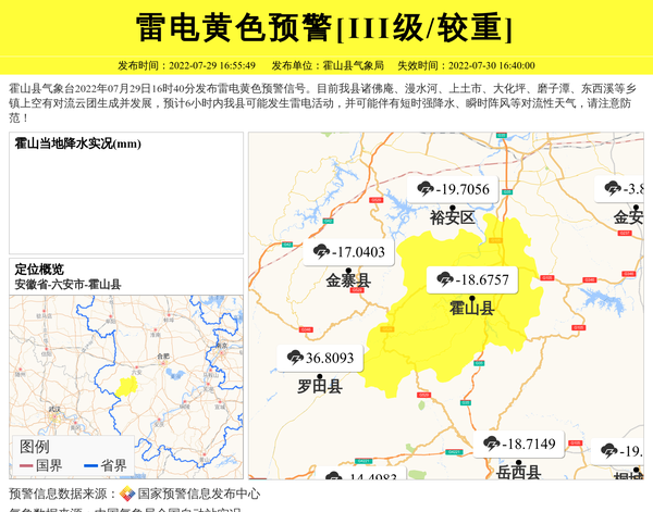 霍山县气象台2022年07月29日16时40分发布雷电黄色预警信号。目前我县诸佛庵、漫水河、上土市、大化坪、磨子潭、东西溪等乡镇上空有对流云团生成并发展,预计6小时内我县可能发生雷电活动,并可能伴有短时强降水、瞬时阵风等对流性天气,请注意防范! 信息来源:国家预警信息发布中心; 发布单位:霍山县气象局。