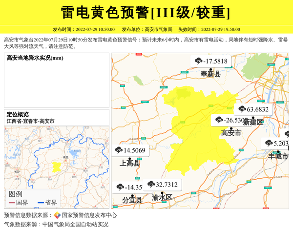 高安市气象台2022年07月29日10时50分发布雷电黄色预警信号:预计未来6小时内,高安市有雷电活动,局地伴有短时强降水、雷暴大风等强对流天气,请注意防范。 信息来源:国家预警信息发布中心; 发布单位:高安市气象局。