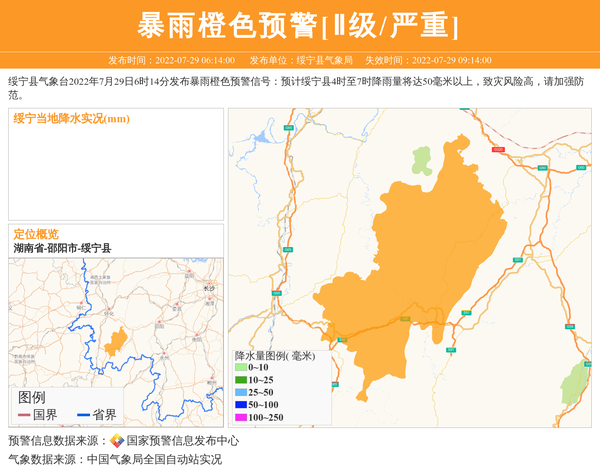 绥宁县气象台2022年7月29日6时14分发布暴雨橙色预警信号:预计绥宁县4时至7时降雨量将达50毫米以上,致灾风险高,请加强防范。 信息来源:国家预警信息发布中心; 发布单位:绥宁县气象局。