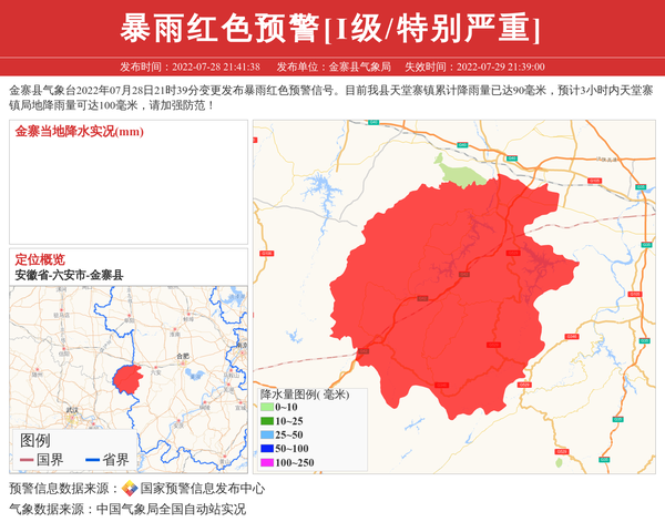 金寨县气象台2022年07月28日21时39分变更发布暴雨红色预警信号。目前我县天堂寨镇累计降雨量已达90毫米,预计3小时内天堂寨镇局地降雨量可达100毫米,请加强防范! 信息来源:国家预警信息发布中心; 发布单位:金寨县气象局。