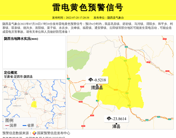 陇西县气象台2022年07月28日17时20分发布雷电黄色预警信号:预计6小时内,我县巩昌镇、碧岩镇、马河镇、渭阳乡、和平乡、柯寨镇、双泉镇、德兴乡、首阳镇、菜子镇、永吉乡、文峰镇、福星镇、通安驿镇、云田镇等部分地区可能发生雷电活动,可能会造成雷电灾害事故。请有关单位和人员做好防范准备! 信息来源:国家预警信息发布中心; 发布单位:陇西县气象台。
