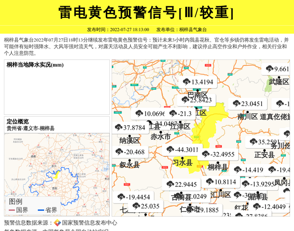 桐梓县气象台2022年07月27日18时13分继续发布雷电黄色预警信号:预计未来3小时内我县花秋、官仓等乡镇仍将发生雷电活动,并可能伴有短时强降水、大风等强对流天气,对露天活动及人员安全可能产生不利影响,建议停止高空作业和户外作业,相关行业和个人注意防范。 信息来源:国家预警信息发布中心; 发布单位:桐梓县气象台。