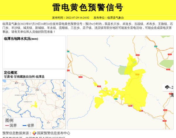 临潭县气象台2022年07月29日16时24分发布雷电黄色预警信号:预计6小时内,我县长川乡、卓洛乡、古战镇、术布乡、王旗镇、石门乡、羊沙镇、城关镇、新城镇、羊永镇、流顺镇、三岔乡、店子镇、洮滨镇等部分地区可能发生雷电活动,可能会造成雷电灾害事故。请有关单位和人员做好防范准备! 信息来源:国家预警信息发布中心; 发布单位:临潭县气象台。