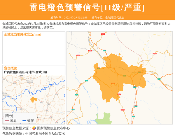 金城江区气象台2022年7月29日5时52分继续发布雷电橙色预警信号:金城江区已经受雷电活动影响且将持续,局地可能伴有短时大风或强降水,易出现灾害事故,请防范。 信息来源:国家预警信息发布中心; 发布单位:金城江区气象台。
