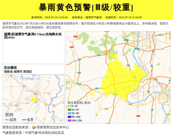 湘潭市气象台2022年7月28日15时3分发布暴雨黄色预警信号:预计雨湖区15时至21时降雨量将达50毫米以上,并伴随冰雹、雷雨大风等强对流天气,致灾风险较高,请注意防范。 信息来源:国家预警信息发布中心; 发布单位:湘潭市气象局。