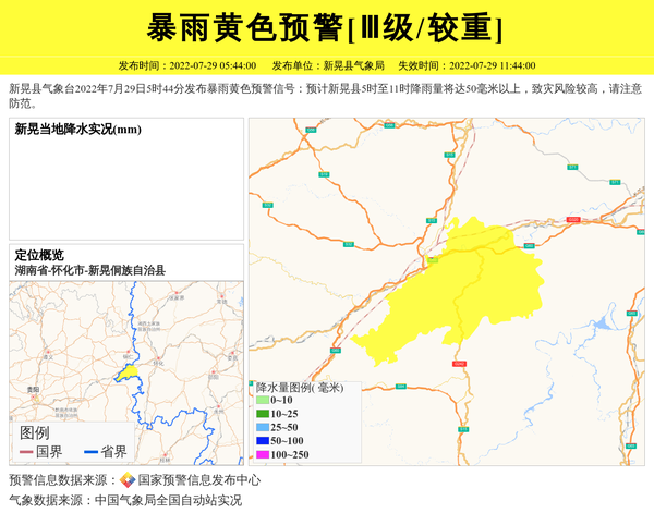 新晃县气象台2022年7月29日5时44分发布暴雨黄色预警信号:预计新晃县5时至11时降雨量将达50毫米以上,致灾风险较高,请注意防范。 信息来源:国家预警信息发布中心; 发布单位:新晃县气象局。