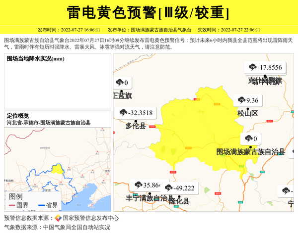 围场满族蒙古族自治县气象台2022年07月27日16时09分继续发布雷电黄色预警信号:预计未来6小时内我县全县范围将出现雷阵雨天气,雷雨时伴有短历时强降水、雷暴大风、冰雹等强对流天气,请注意防范。 信息来源:国家预警信息发布中心; 发布单位:围场满族蒙古族自治县气象台。