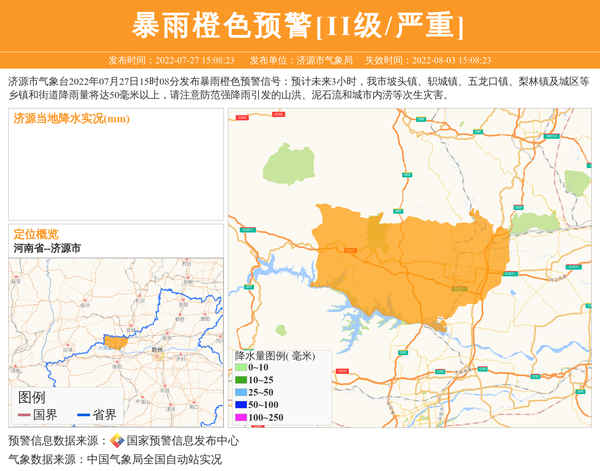 济源市气象台2022年07月27日15时08分发布暴雨橙色预警信号:预计未来3小时,我市坡头镇、轵城镇、五龙口镇、梨林镇及城区等乡镇和街道降雨量将达50毫米以上,请注意防范强降雨引发的山洪、泥石流和城市内涝等次生灾害。 信息来源:国家预警信息发布中心; 发布单位:济源市气象局。
