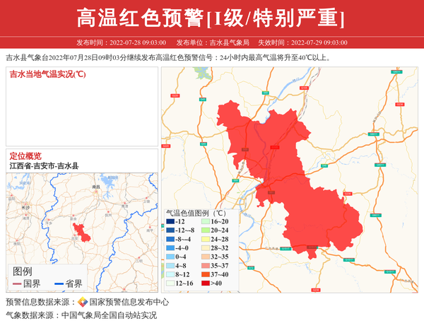 吉水县气象台2022年07月28日09时03分继续发布高温红色预警信号:24小时内最高气温将升至40℃以上。 信息来源:国家预警信息发布中心; 发布单位:吉水县气象局。