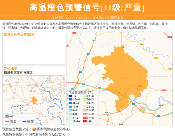南溪区气象台2022年07月29日10时12分发布高温橙色预警信号:预计我区仙源街道、南溪街道、裴石镇、长兴镇、仙临镇、黄沙镇、汪家镇、大观镇、刘家镇未来24小时内最高气温将升至38℃以上。请注意用火用电安全,做好防暑防晒工作。 信息来源:国家预警信息发布中心; 发布单位:南溪区气象台。