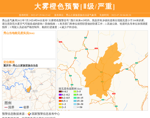 秀山县气象局2022年7月29日4时00分发布“大雾橙色预警信号”:预计未来6小时内,我县所有乡镇街道将出现能见度小于200米的雾。请注意防范大雾天气可能造成的影响!防御指南:1.有关部门和单位按照职责做好防雾工作;2.高速公路、轮渡码头等单位加强调度指挥;3.驾驶人员必须严格控制车、船的行进速度;4.减少户外活动。 信息来源:国家预警信息发布中心; 发布单位:秀山土家族苗族自治县气象局。
