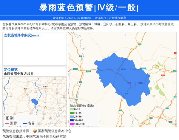 左权县气象局2022年7月27日18时01分发布暴雨蓝色预警,预警区域:城区、辽阳镇、石匣乡、寒王乡。 预计未来12小时预警区域的部分乡镇降雨量将达50毫米以上。请有关单位和人员做好防范准备。 信息来源:国家预警信息发布中心; 发布单位:左权县气象局。