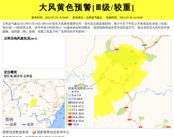 云和县气象台2022年07月29日14时10分发布大风黄色预警信号:受对流云团发展影响,预计今天下午到上半夜我县各乡镇(街道)将出现7~9级雷雨大风,并可伴有小时雨强20~40毫米的短时强降水、强雷电和局地冰雹等强对流天气。请注意防范大风对室外搭建棚、临时建(构)筑物、在建工程及户外广告牌等的不利影响! 信息来源:国家预警信息发布中心; 发布单位:云和县气象台。