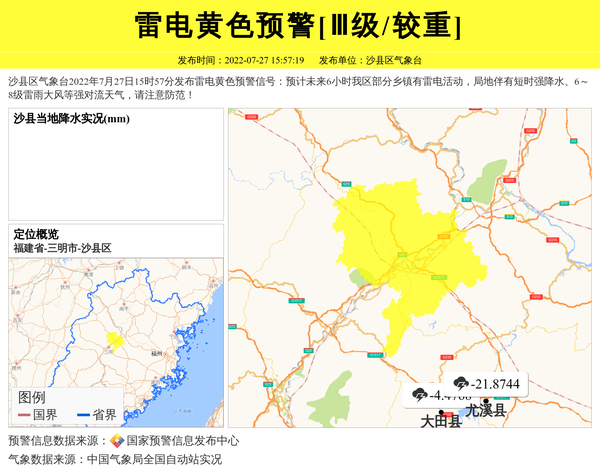 沙县区气象台发布雷电黄色预警[Ⅲ级/较重]