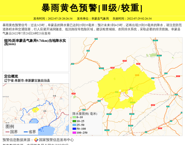 暴雨黄色预警信号:过去3小时,阜蒙县的降水量已达到25到35毫米;预计未来3到4小时,还将出现25到35毫米的降水,请注意防范道路积水和交通阻塞,行人应避开涵洞隧道、低洼路段等危险区域,建议检查城镇、农田排水系统,采取必要的排涝措施。阜蒙县气象台2022年7月28日20时23分发布 信息来源:国家预警信息发布中心; 发布单位:阜蒙县气象局。