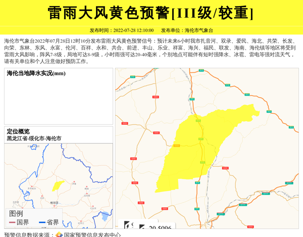 海伦市气象台2022年07月28日12时10分发布雷雨大风黄色预警信号:预计未来6小时我市扎音河、双录、爱民、海北、共荣、长发、向荣、东林、东风、永富、伦河、百祥、永和、共合、前进、丰山、乐业、祥富、海兴、福民、联发、海南、海伦镇等地区将受到雷雨大风影响,阵风7-8级,局地可达8-9级,小时雨强可达20-40毫米,个别地点可能伴有短时强降水、冰雹、雷电等强对流天气,请有关单位和个人注意做好预防工作。 信息来源:国家预警信息发布中心; 发布单位:海伦市气象台。